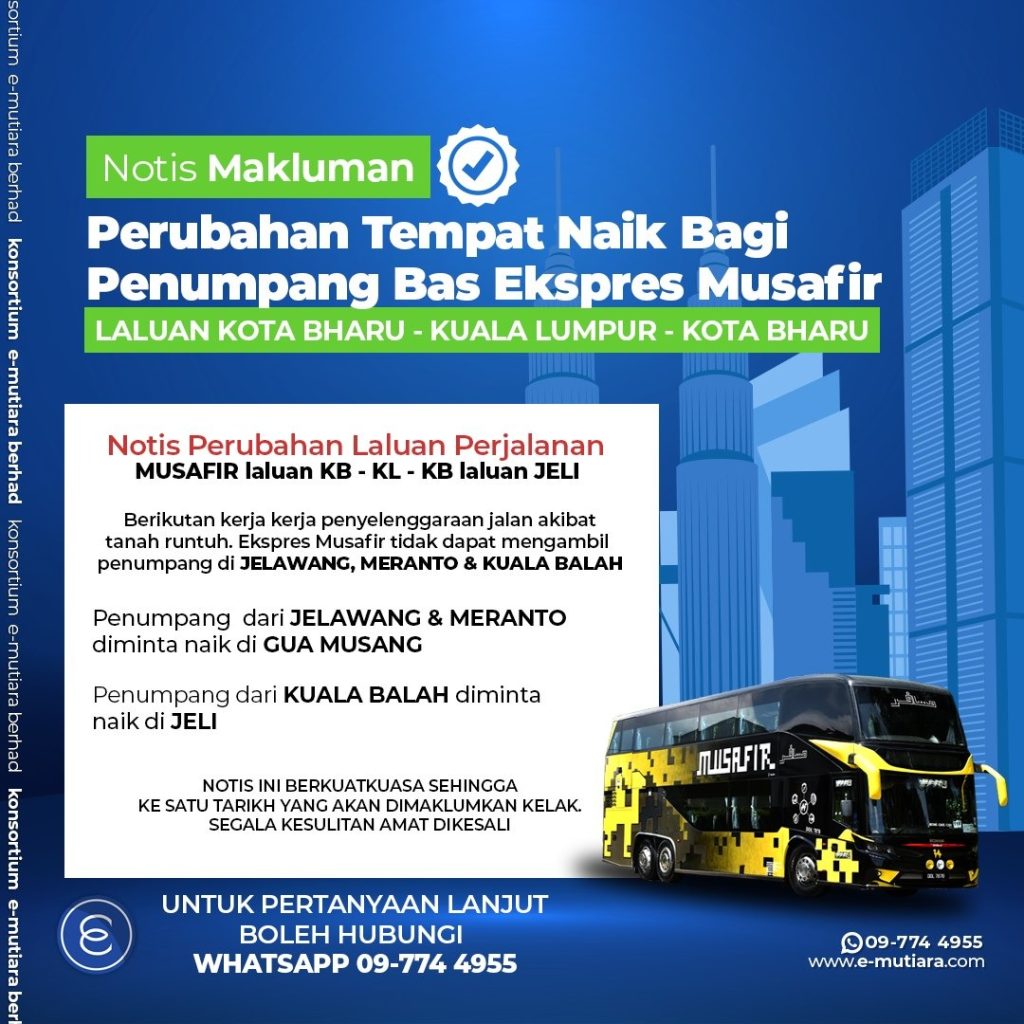 Berikutan dengan itu, pickup point bagi penumpang Jelawang, Meratoh & Kuala Balah terpaksa di ubah sehingga ke satu tarikh yang akan dimaklumkan kelak.